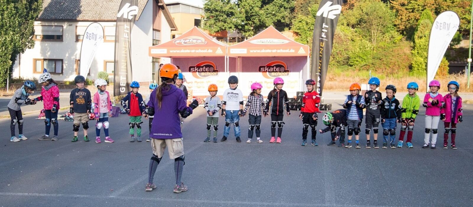 Im Rahmen des Projektes „skate@school“ kommen mobile Trainerteams von Skate Network e.V. mit einem Material-Verleih direkt in die Schulen und führen dort für interessierte Klassen/ Gruppen ein Inline Skating-Training durch (auch im Rahmen von Wandertagen, Projektwochen, etc.).